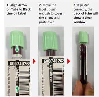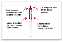 Barcode labels must be placed lengthways on the specimen tube, and not wrapped horizontally around the tube. The laboratory’s barcode scanner can read the labels only if they are placed lengthways. Refer to Figure 2 on how to label a tube correctly.