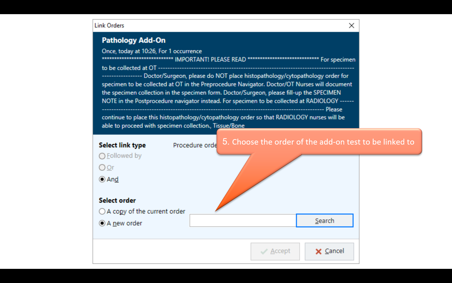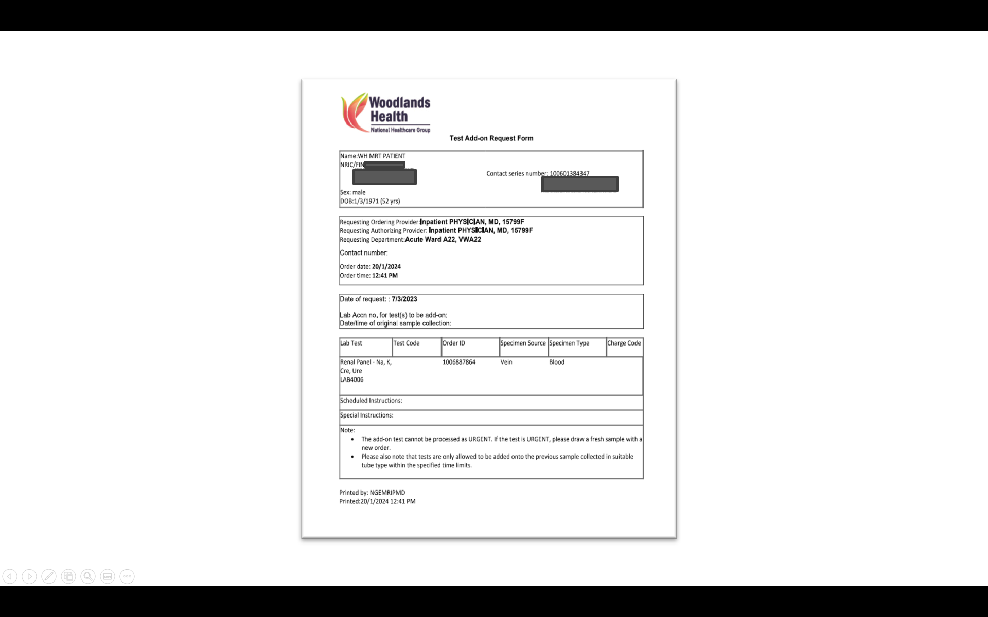 Add-on test orders involve a lot of work for laboratory personnel (i.e. retrieval of specimen, re-ordering of test, and re-analysis of specimen). Hence, add-on test orders should be made sparingly, and on the understanding that they are not routine practice. Add-on test orders are not considered urgent. If an urgent result is required, clinicians should order a new test and send a new specimen.